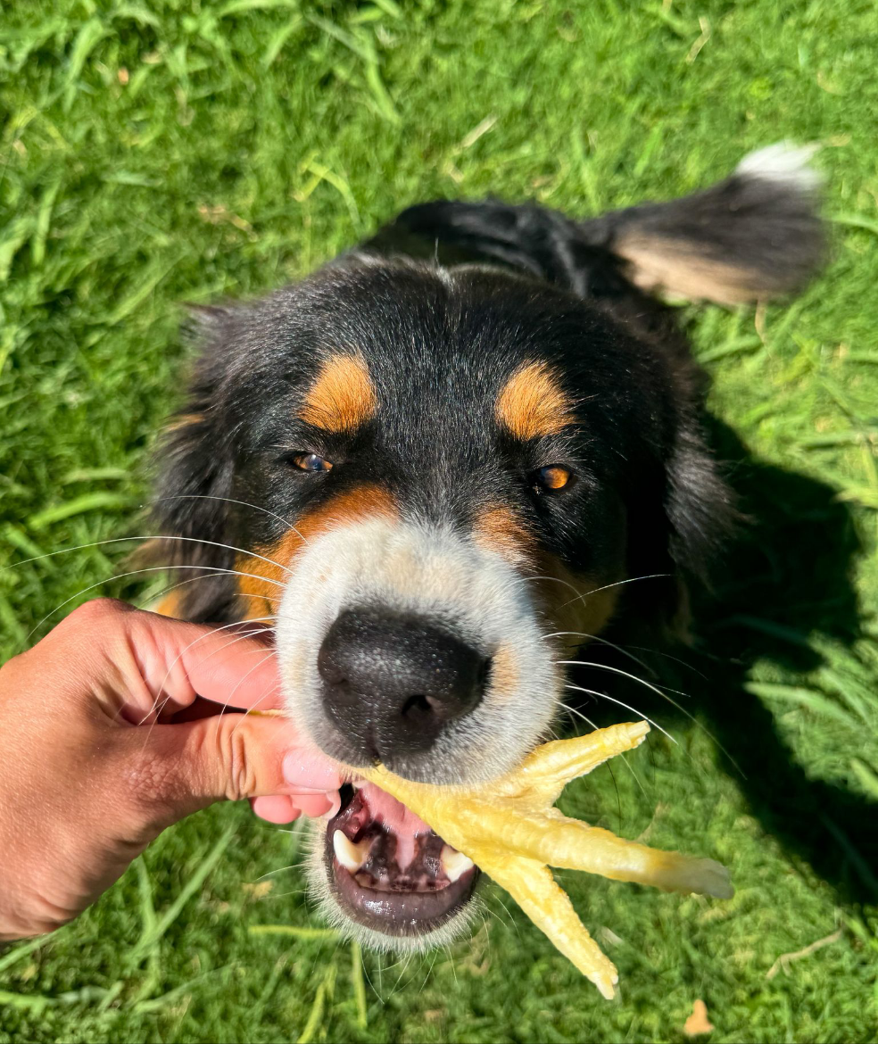 Légères comme une plume et pourtant ultra gourmandes, les pattes de poulet soufflées sont obtenues grâce à une cuisson douce qui “gonfle” l’os et le rend beaucoup plus friable. Résultat : une friandise croustillante, facile à croquer et à digérer, qui convient même aux petites mâchoires ou aux chiens qui n’oseraient pas s’attaquer à une patte de poulet classique.