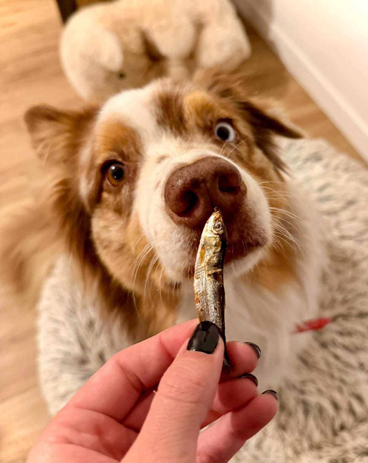 Pour encore plus de plaisir, casse les sprats en petits morceaux à parsemer sur sa gamelle.